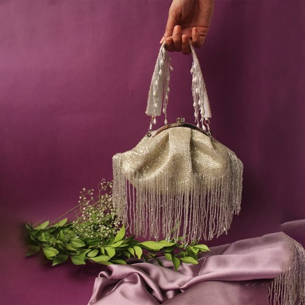 Hand embroidered Silver framed potli/clutch with salli work, and tassels. The removable handle allows you to carry the potli like a clutch. the handle is encrusted with tassels and pearls too.. Work on both sides.