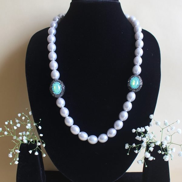 Silver shell pearls with cz beads with two subtle teal statement stones.