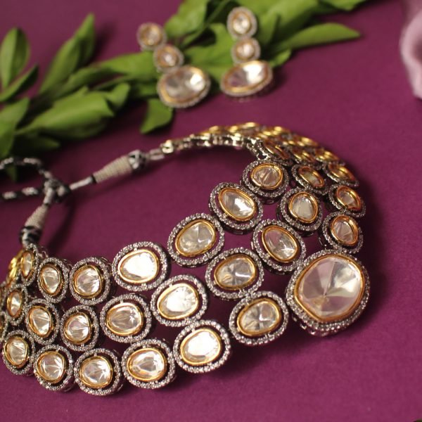Feel like an absolute queen in this glorious tri-line polki set, handcrafted to perfection and fulfill the glamour and luxe element in any look.